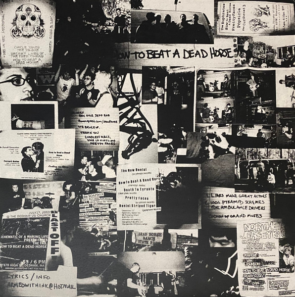 Pressed on transparent red vinyl with no center labels. The front and back covers are two separate single-sided pieces of manila-colored paper printed with cover artwork. Includes 8.5×8.5″ double-sided photocopied insert containing a movie still background, track listing, lyrics, and credits on the Pretty Faces side and a gig flyer background, track listing, credits, and contact info on the How To Beat A Dead Horse side. Instead of an inner sleeve there is a folded poster printed with various medical and anatomical photos.