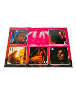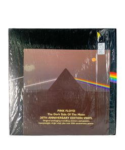 1 large square insert/sticker, originally positioned over the front cover, under shrink: “Pink Floyd The Dark Side Of The Moon 30th Anniversary Edition Vinyl original packaging including stickers and posters heavyweight virgin vinyl plus new 30th anniversary poster”.
