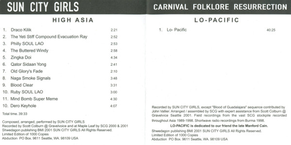Disc 2 “Blood of Guadalajara” sequence contributed by John Vallier. Arranged / assembled by SCG with expert assistance from Scott Colburn @ Gravelvoice Seattle 2001. Field recordings from the vast SCG stockpile recorded throughout Asia 1989-1998. Shortwave recordings from Burma 1998. Dedicated to our friend the late Manford Cain.