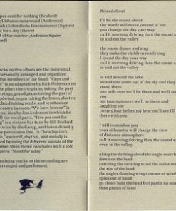 Five tracks of this album are the individual ideas, personally arranged and organised, by the five members of the Band. “Cans And Brahms” is an adaptation by Rick Wakeman on which he plays electric piano taking the part of the strings, grand piano taking the part of the woodwind, organ taking the brass, electric harpsichord taking reeds, and synthesizer taking contra bassoon. “We Have Heaven” is a personal idea by Jon Anderson in which he sings all the vocal parts. “Five Per Cent For Nothing” is a sixteen bar tune by Bill Bruford, played twice by the Group, and taken directly from the percussion line. In Chris Squire’s “The Fish”, each riff, rhythm, and melody is produced by using the different sounds of the bass guitar. Steve Howe concludes with a solo guitar piece “Mood For A Day”